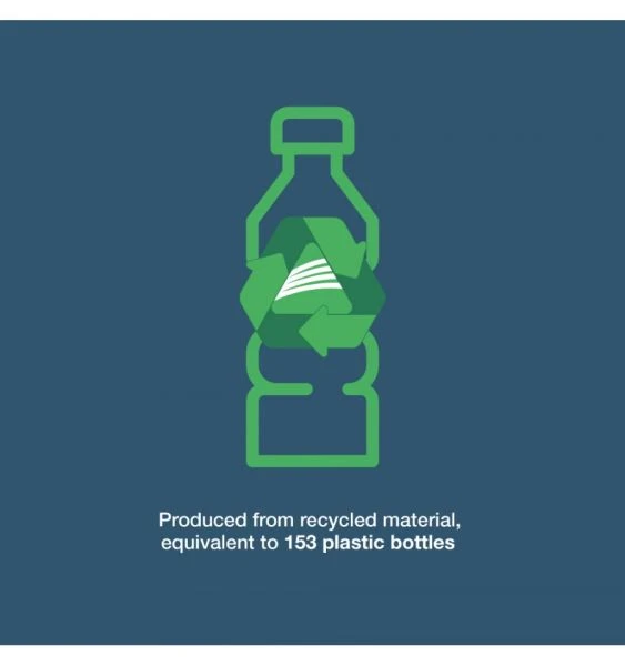 - Produced from recycled material equivalent to 153 plastic bottles