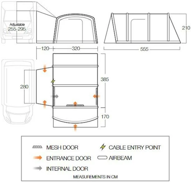 Throughout the awning there are ventilation points low and high. All of the doors that lead into the main body of the awning feature a mesh door. The two side doors also have a drop-down lip to allow you to bring wheel chairs and push chairs in. There are 4 different attachment methods that can be used to connect the awning to your vehicle, whether it’s via a Kador Beading, Throw Over Straps, Velcro tabs for a roof rack or a Sleeve so that a pole can be threaded through and clamped into a gutter. Two tunnel doors allow the use to enter their vehicle without having to go through the awning and other key features included zip up curtains, oversized Airbeams, a sewn-in groundsheet and Vango’s SkyTrack System.