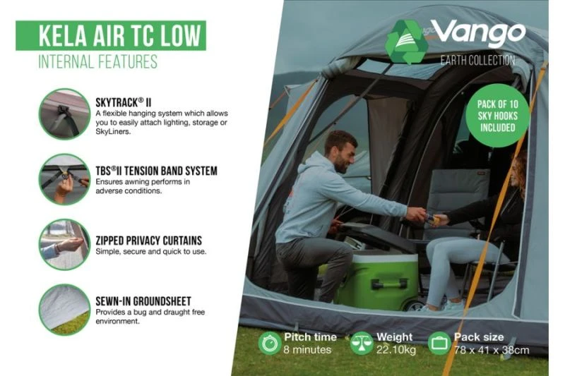 The Vango Kela Air TC awning is back and better than ever for the 2023 season! Utilizing Vango’s all-new Sentinel Eco TC fabric (made from polyester using recycled bottles & single-use plastics and environmentally friendly cotton), this awning comes as a Low (180-210cm) this means that it is designed to fit any campervan. As the TC fabric used is breathable it means that on a hotter day it would be a lot cooler inside the awning, plus there would be less condensation as moisture can pass through the material. Vango have developed a feature called ColourLok ™ which is embedded into the fabric to make the material last longer and as the name suggests, it holds the colour for longer.