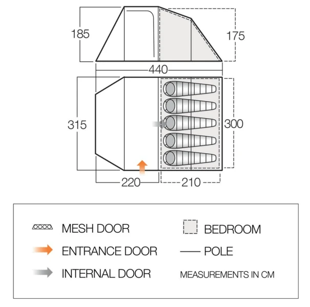 - Linked-In Groundsheet – Easy to clean groundsheet that can be attached or detached from the living area. Simply roll under the bedroom area when not required