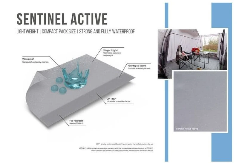 - Sentinel Active – When pack size and weight are the key influencers in choosing your awning, our specifically designed Sentinel Active fabric will surpass your needs. Sentinel Active is strong, whilst being fully waterproof, ensuring great quality and performance coupled with compact pack sizes.